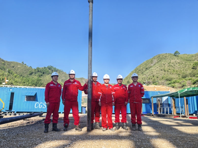 长沙中心党委高度重视、科学统筹,迅速成立现场工程指挥部,遴选精干技术力量,实施全周期精细化管理。实施本次任务的钻井队伍以原武警黄金部队官兵为主体,褪去戎装,志在能源,他们用钻头书写忠诚,把井场作为新“战场”,将“勇上一线、勇打头阵、勇立新功”的战斗精神深深熔铸在一尺一寸的钻探进程中。面对灰岩地层坚硬破碎、漏失严重、软硬频繁互层、地层水敏性强以及局部井段岩层倾角高达50°等系列难题,钻井队伍自主创新、集智攻坚,积极践行绿色勘查理念,先后突破高效护壁堵漏、井斜精准控制、机械钻速提升和恶性漏失固井等多个关键技术瓶颈,通过自主研发的废浆处理系统,实现钻井废浆的无害化处理与绿色循环。