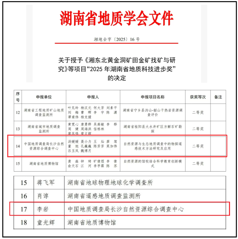 近日,湖南省地质学会公布了“2025年度湖南省地质科技进步奖”评选结果,中国地质调查局长沙自然资源综合调查中心(简称“长沙中心”)申报的“自然资源与生态地质调查中的物探遥感技术方法研究及应用”获湖南省地质科技奖进步奖二等奖,李岩同志荣获湖南省青年地质科技奖,实现科研成果与人才培养的双重突破。